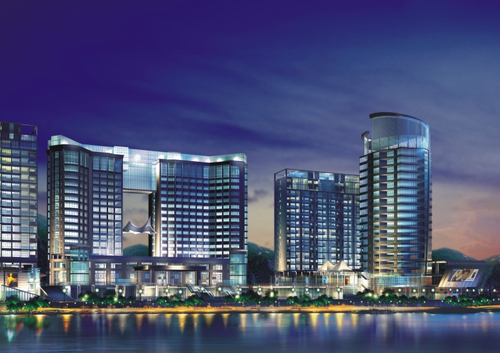 本工程在總體布局及環境設計上以酒店主樓為中心,酒店式公寓寫字樓平行布置于兩側形成開敞的廣場空間。廣場抬高一層,布置商城,結合下沉式廣場,形成層次豐富,錯落有致的廣場空間和商業空間。建筑群沿湖立面較為完整,酒店的中心地位顯赫。建筑平面設計功能明確合理,酒店主樓原有建筑為18層,新建25層 。
