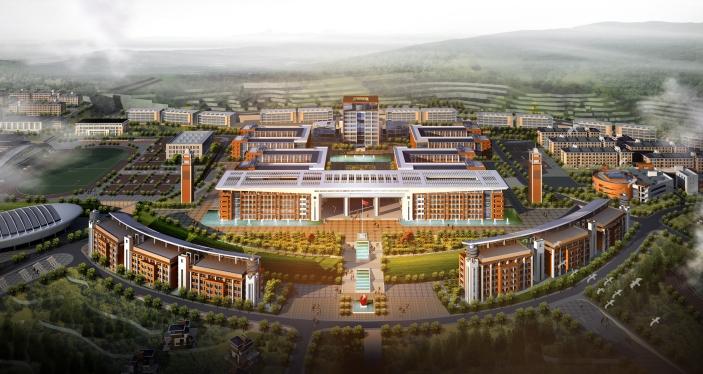 云南技師學院規劃總體形式特色鮮明,以觀音山山體為主體,因地制宜地布局,以中心教學組團為核心,大致順等高線成環布置路網,形成兩條優美的弧線線條舒展于山體南北兩側,將中心組團區域含在其中,貫穿基地中心的南北主軸線,一統控制了整個校區,強化了中正大氣的校園特色。東西宿舍組團和原有校區均勻布滿了整個基地,勻稱且自然。