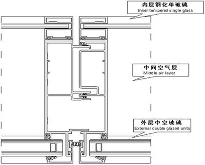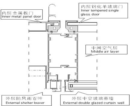 ●系統(tǒng)構(gòu)成——整體為單元式結(jié)構(gòu),外層采用封閉中空玻璃,內(nèi)層為單層玻璃翻窗,中間空氣層位置設(shè)置遮陽百葉;出風口與建筑空調(diào)系統(tǒng)相連。