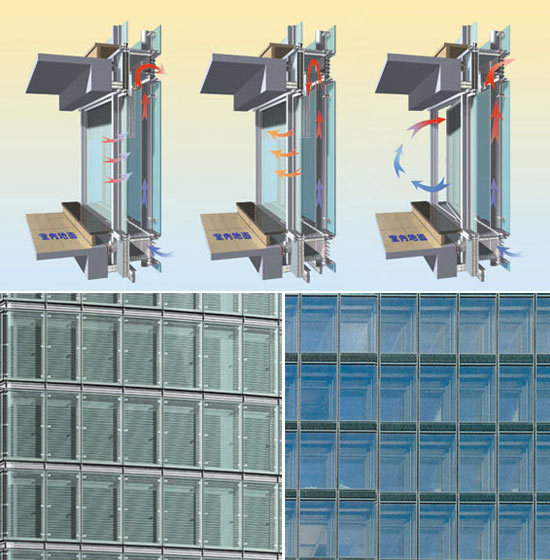 由外層幕墻,內(nèi)層幕墻、遮陽裝置,進風裝置、出風裝置組成。其設(shè)計理念是實現(xiàn)節(jié)能、環(huán)保,使室內(nèi)生活工作環(huán)境與室外自然環(huán)境達到融和。